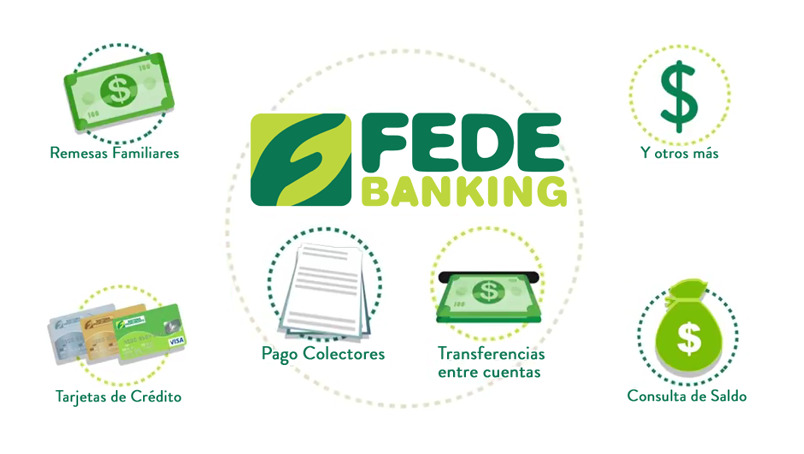 Con FEDE BANKING, puedes consultar el saldo o los movimientos de tu tarjeta de crédito, cobrar tus remesas familiares, transferir fondos en línea, realizar el pago de colectores(luz, agua, telefonía, etc), y mas...